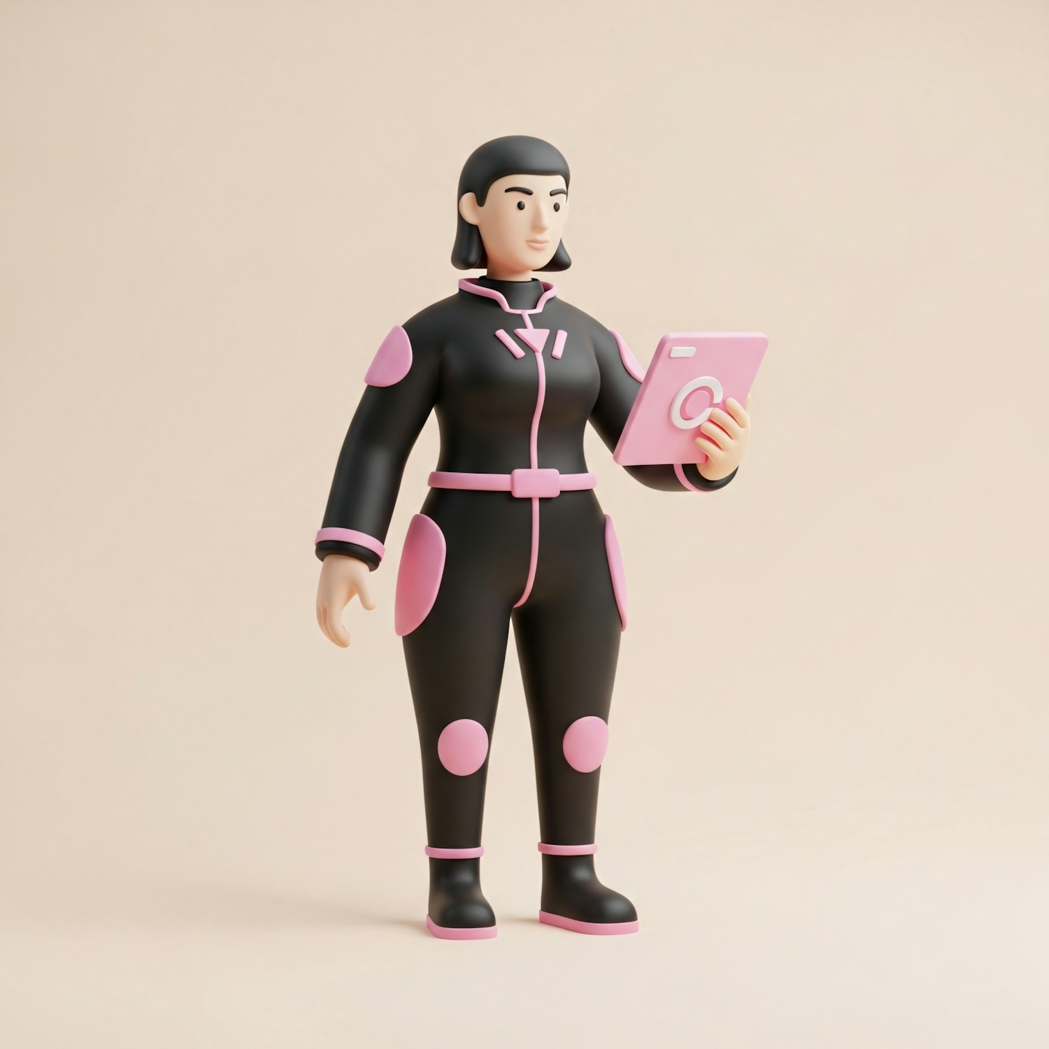 A 3D illustration of a character in a black and pink futuristic suit holding a tablet, set against a plain beige background.