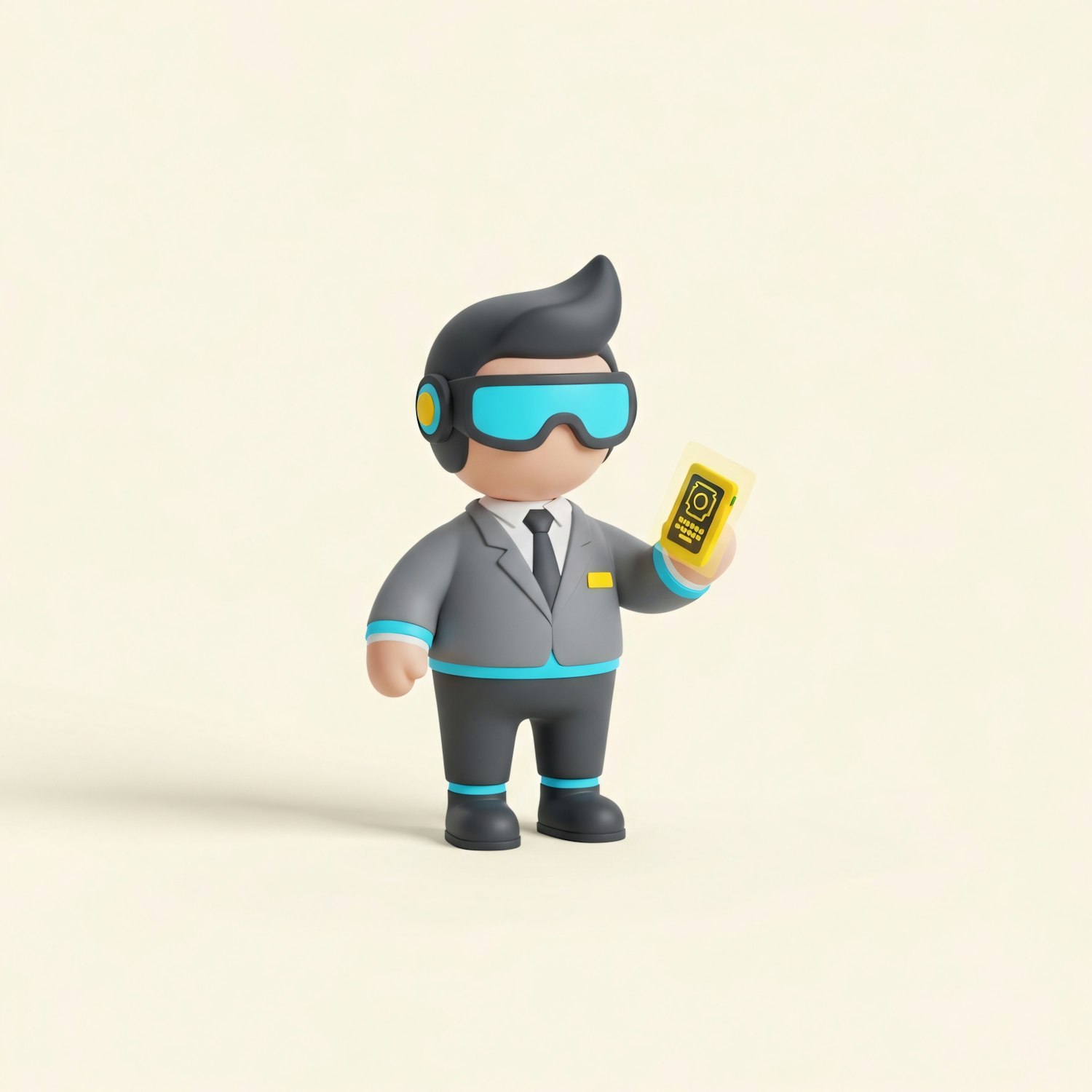 A 3D illustration of a futuristic character in a suit holding a yellow device, featuring blue accents and a sleek design.