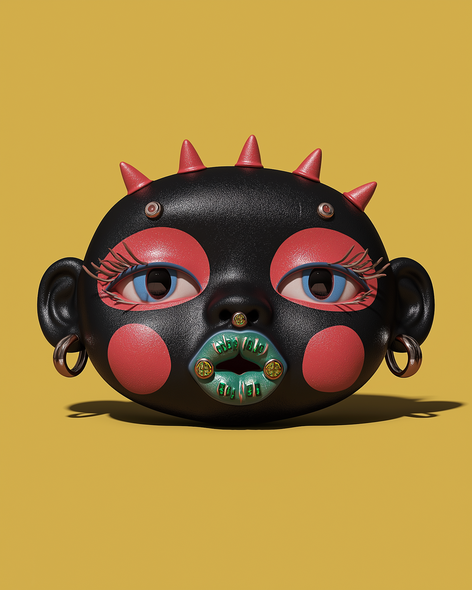 A bold 3D character design with striking colors, featuring red spikes, green lips, and a mustard yellow background.