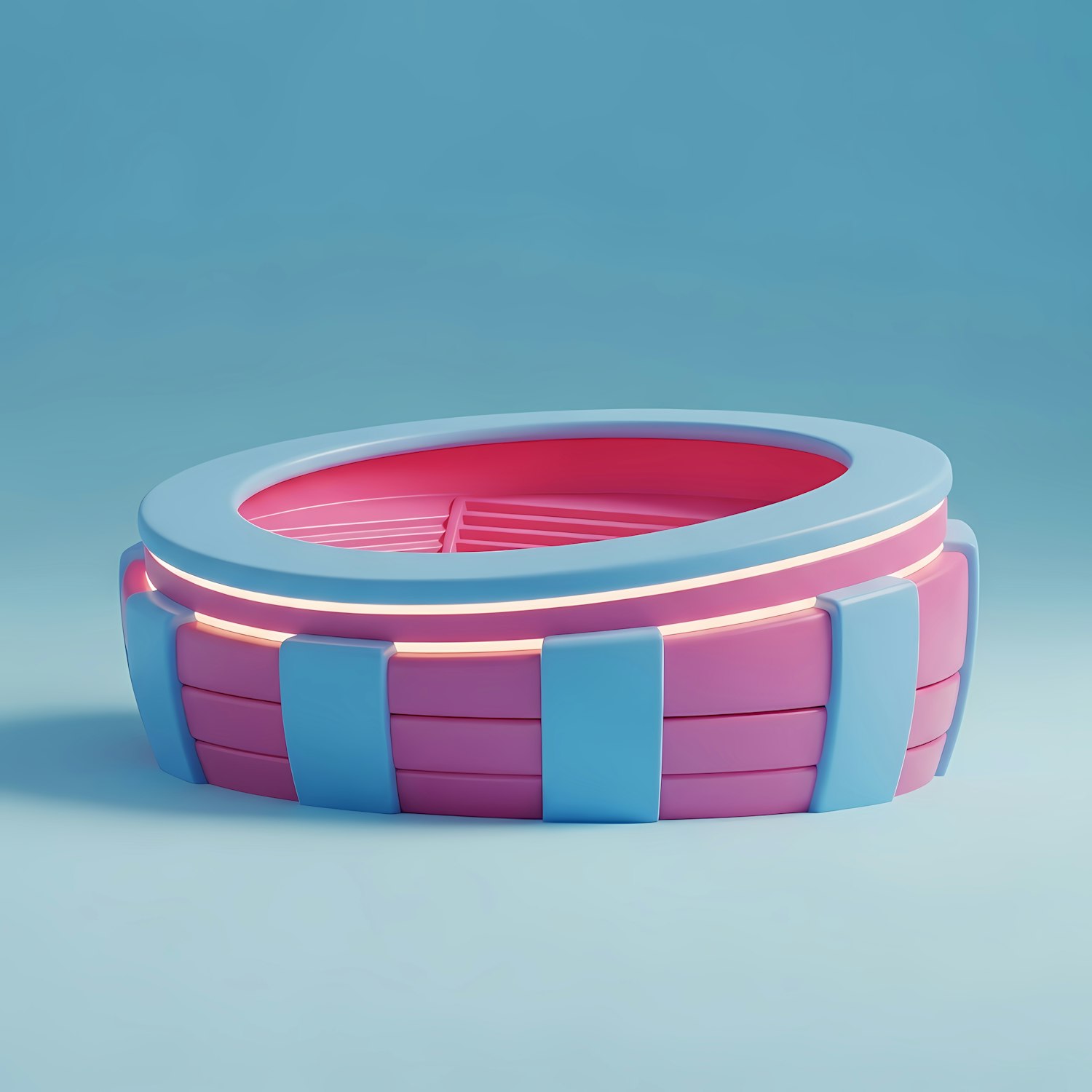 A vibrant 3D-rendered circular object with pink and blue segments, glowing accents, and a sleek futuristic design.