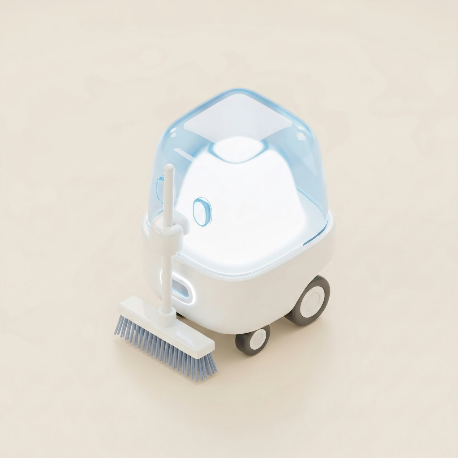 A sleek, modern cleaning robot with a white body, blue dome, and attached broom, set against a neutral beige background.