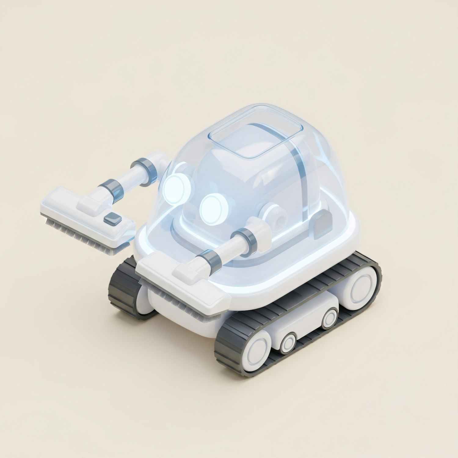 A futuristic cleaning robot with a transparent dome, glowing lights, and tank-like tracks, designed for efficiency and modern aesthetics.