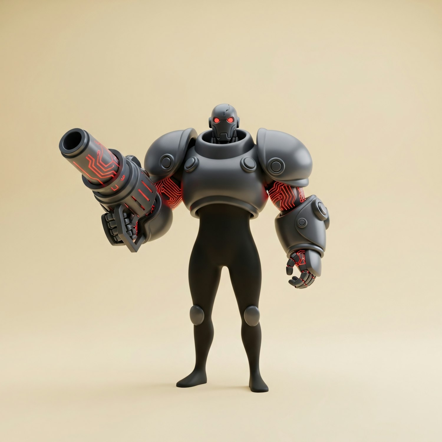 A sleek humanoid robot with glowing red accents and a cannon arm stands against a plain beige background, showcasing a futuristic design.