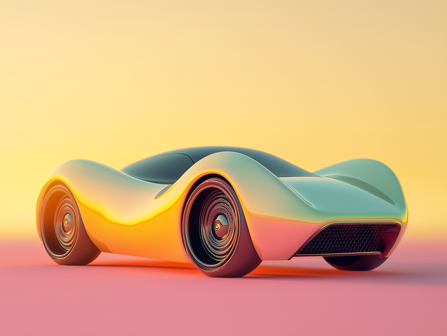 A sleek futuristic concept car with smooth curves and a glossy finish, set against a vibrant gradient background of yellow and pink.