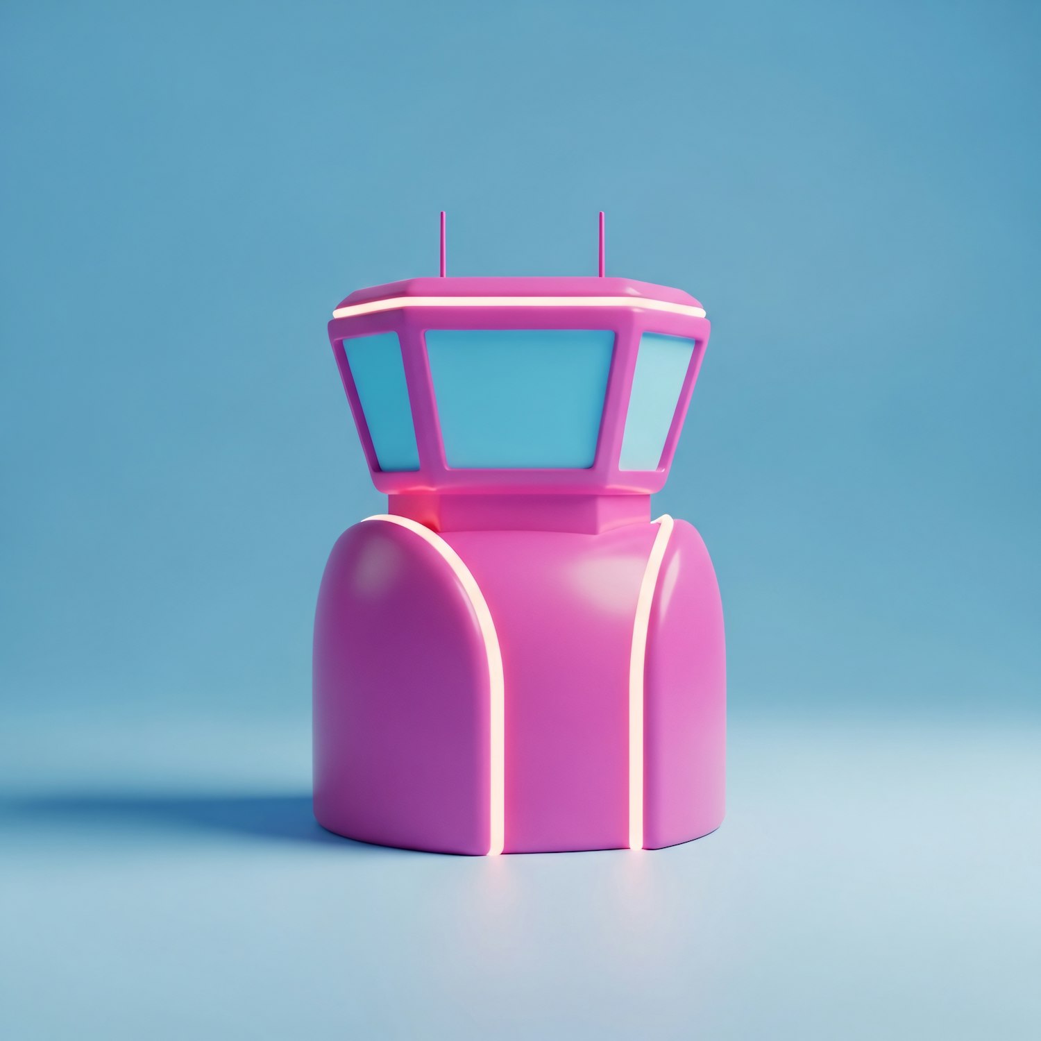 A vibrant 3D-rendered control tower with a pink base and blue windows, set against a light blue background, showcasing a futuristic design.