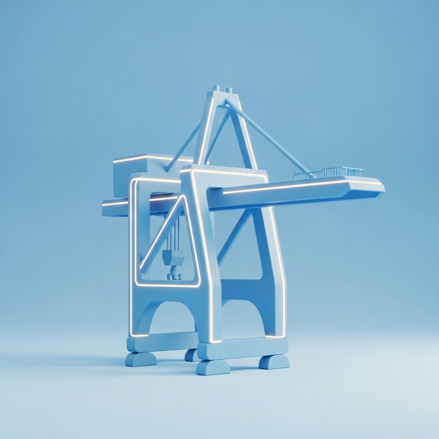 A futuristic 3D-rendered crane in a sleek blue design with glowing accents, set against a gradient blue background.