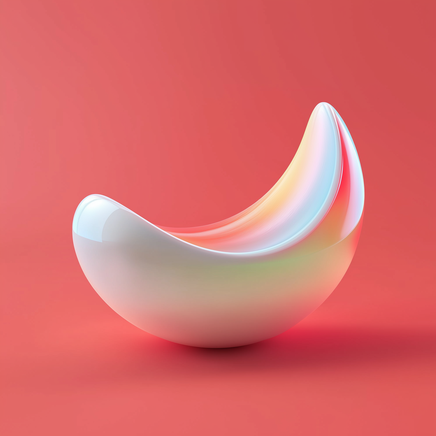 A glossy crescent-shaped 3D object with pastel gradients on a coral red background, blending minimalism and futuristic design.