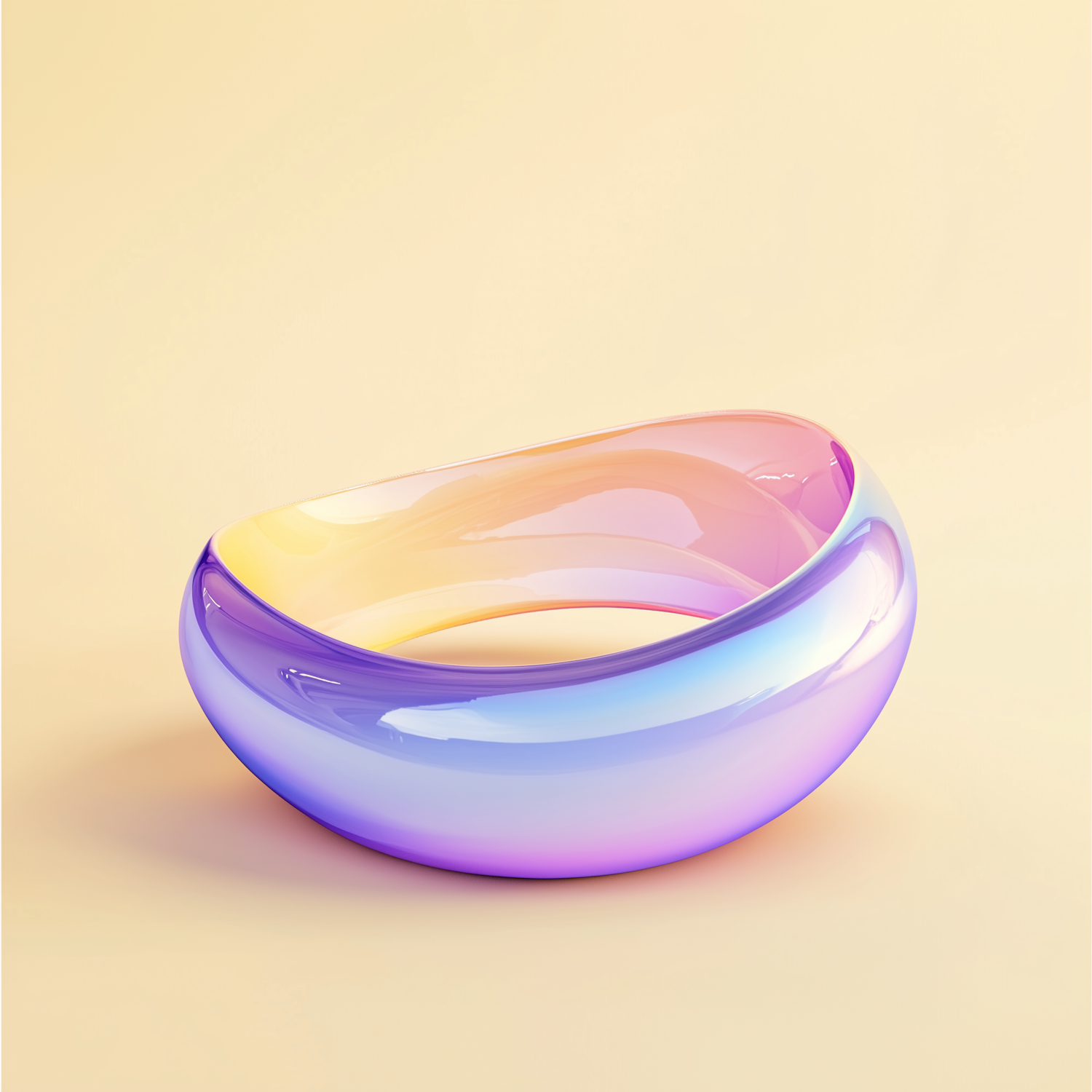 A vibrant 3D-rendered crescent-shaped object with a glossy, translucent gradient finish on a soft yellow background.