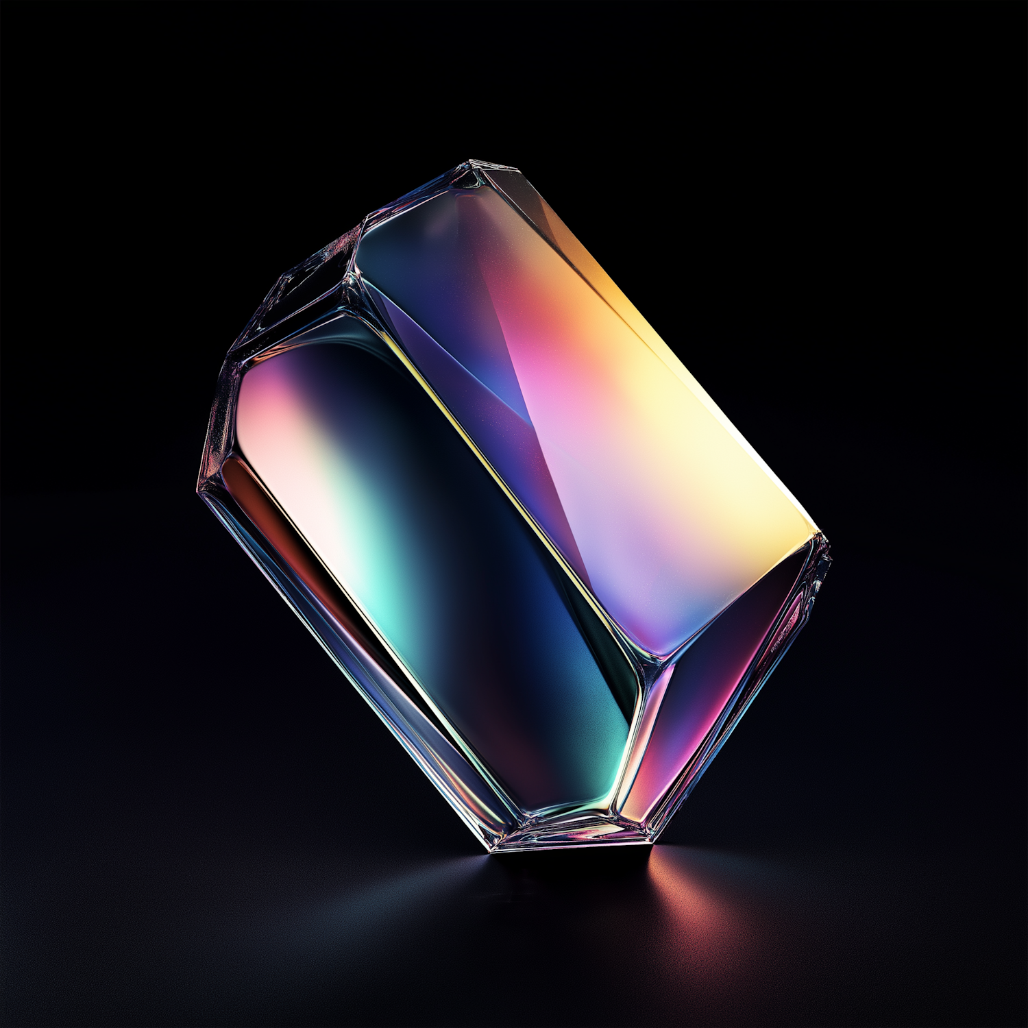 A futuristic crystal object with vibrant gradient colors and sharp facets, glowing against a black background. Modern and artistic design.