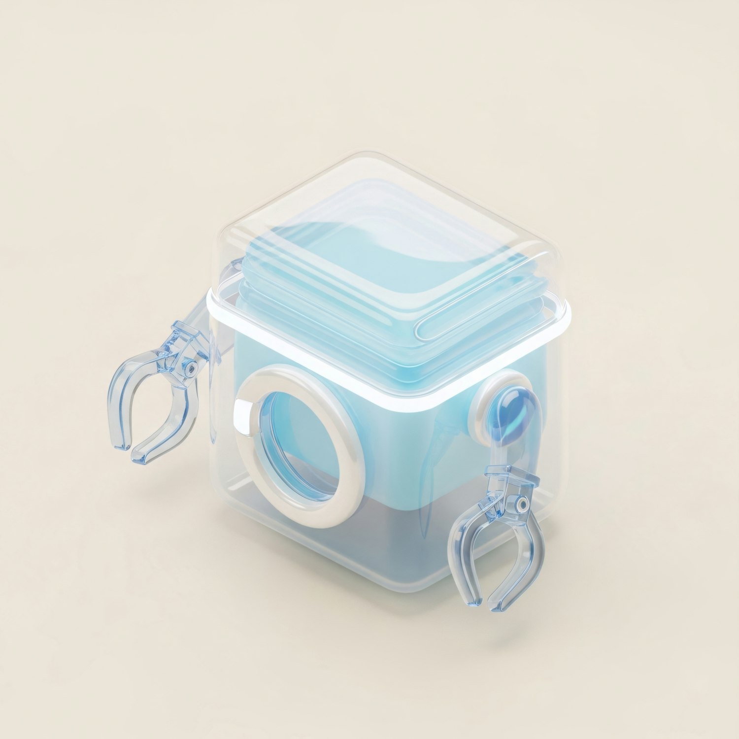 A futuristic 3D-rendered transparent cube with blue accents and mechanical claws, set against a neutral beige background.