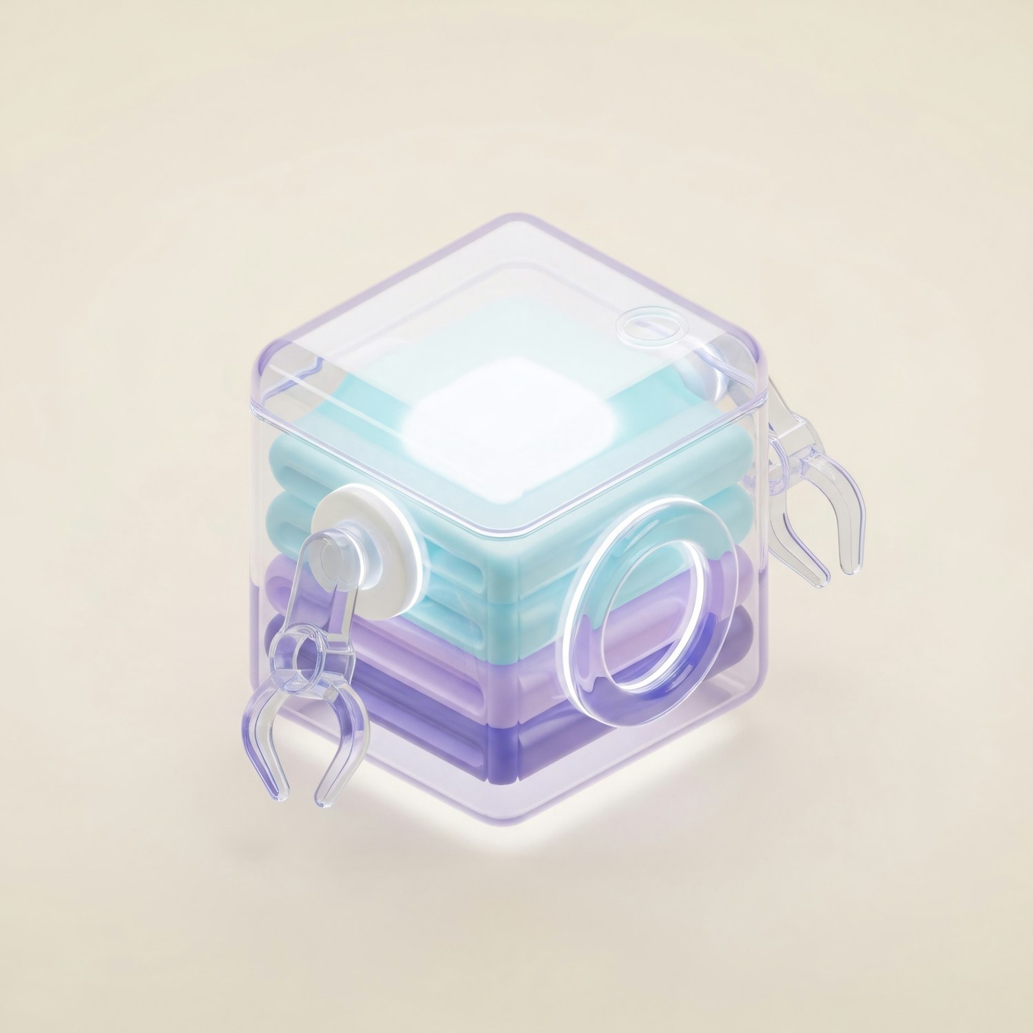 A transparent cube with pastel layers and robotic claws, set against a neutral background, showcasing a modern and futuristic design.