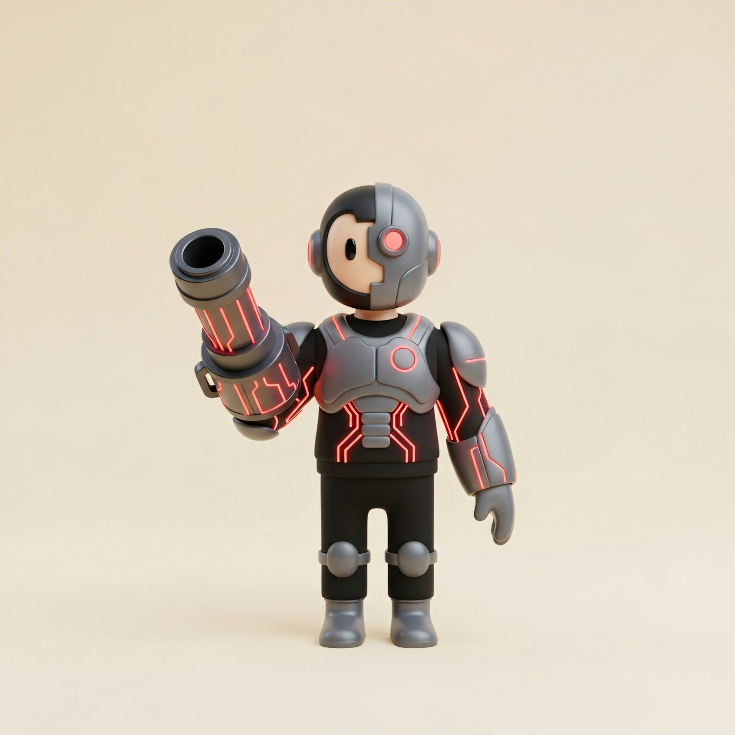 A futuristic 3D character in a glowing robotic suit holding a high-tech cannon, set against a neutral background.