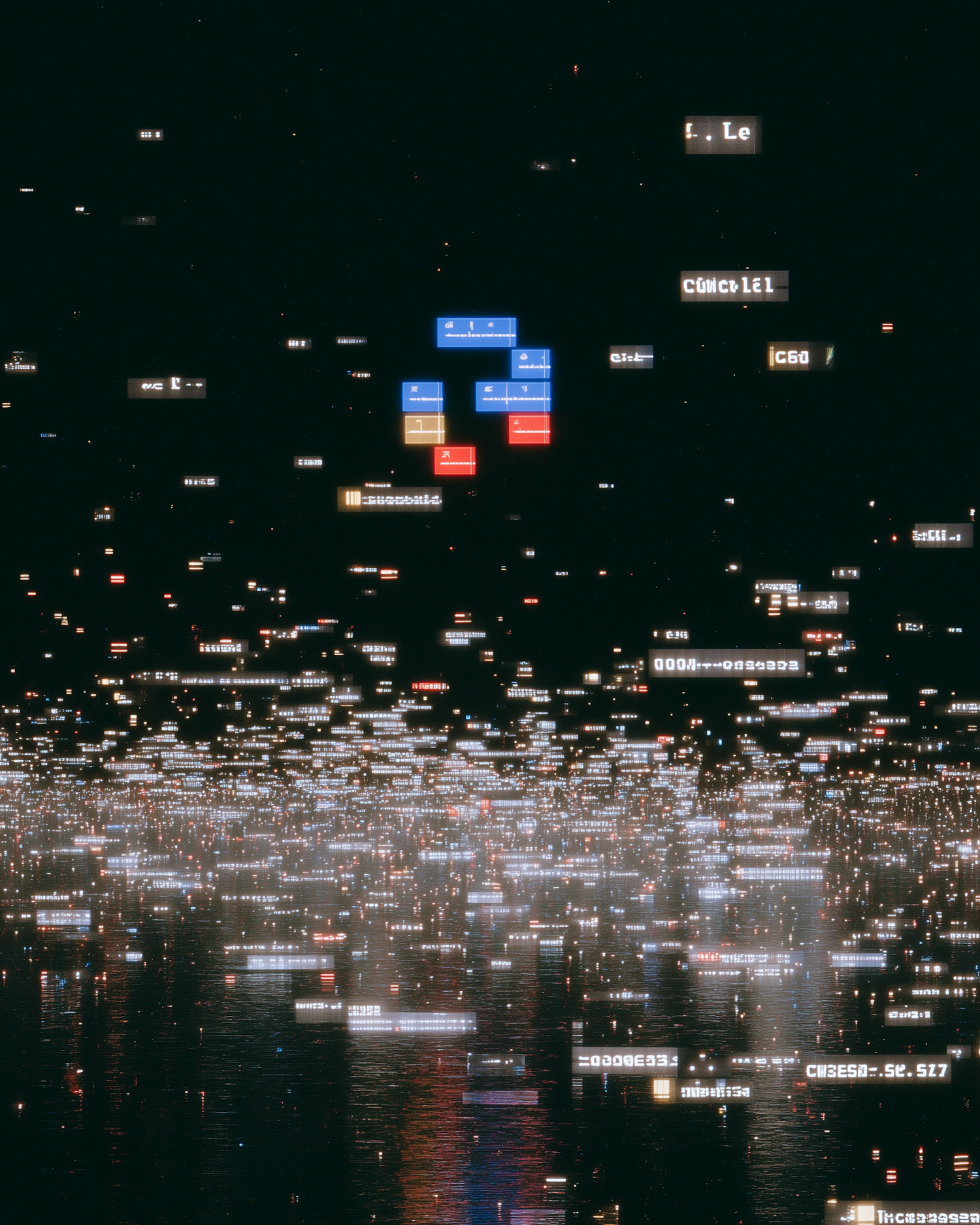 A digital landscape with floating text and glowing data blocks, creating a futuristic and cybernetic atmosphere.