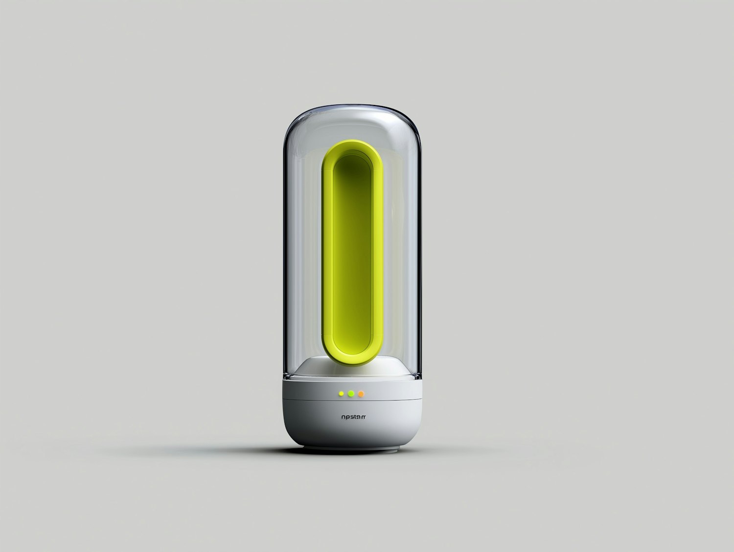 Minimalist cylindrical device with a transparent shell and bright yellow-green core, featuring a white base with indicator lights.