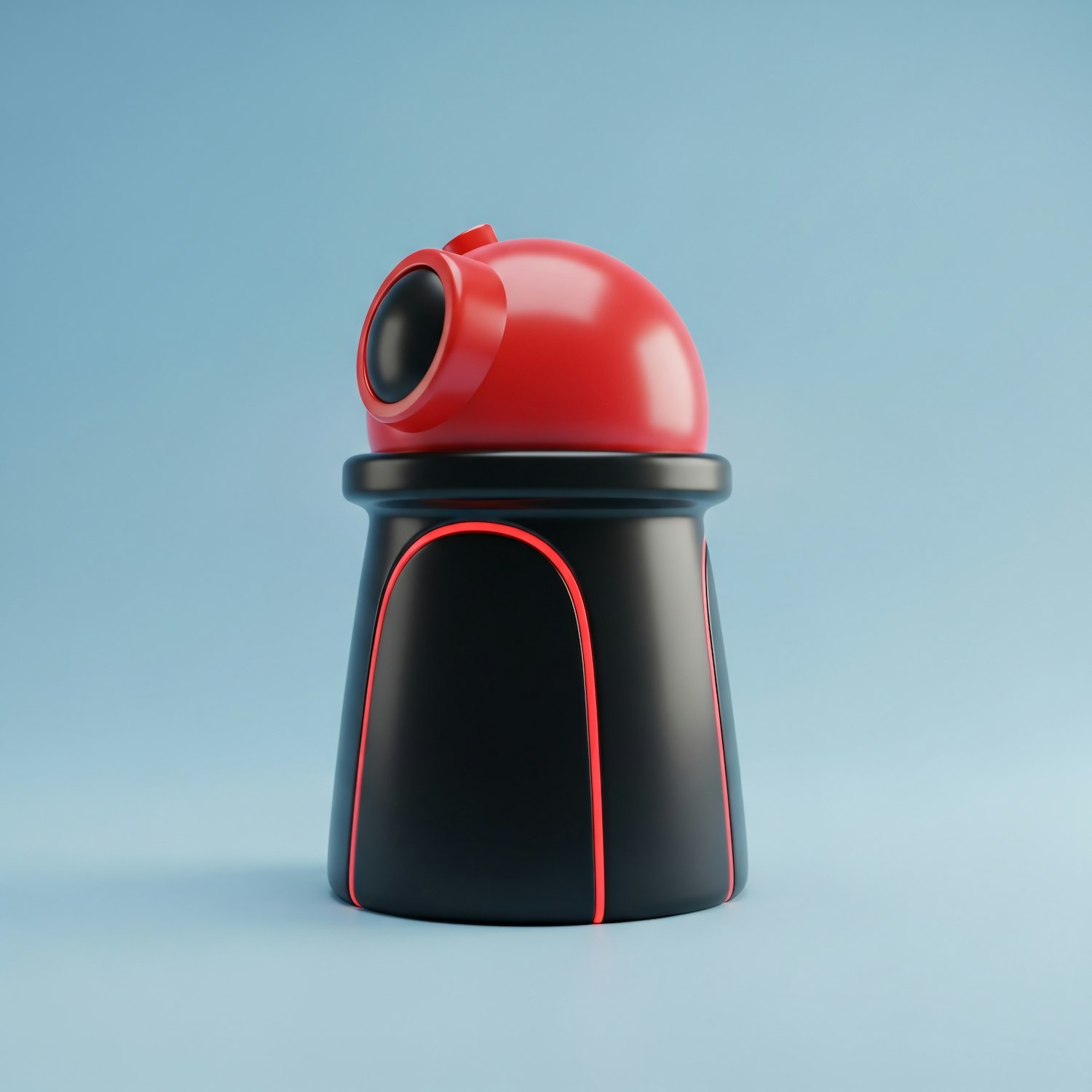 A sleek 3D-rendered futuristic object with a black base, red accents, and a rounded red top, set against a light blue background.