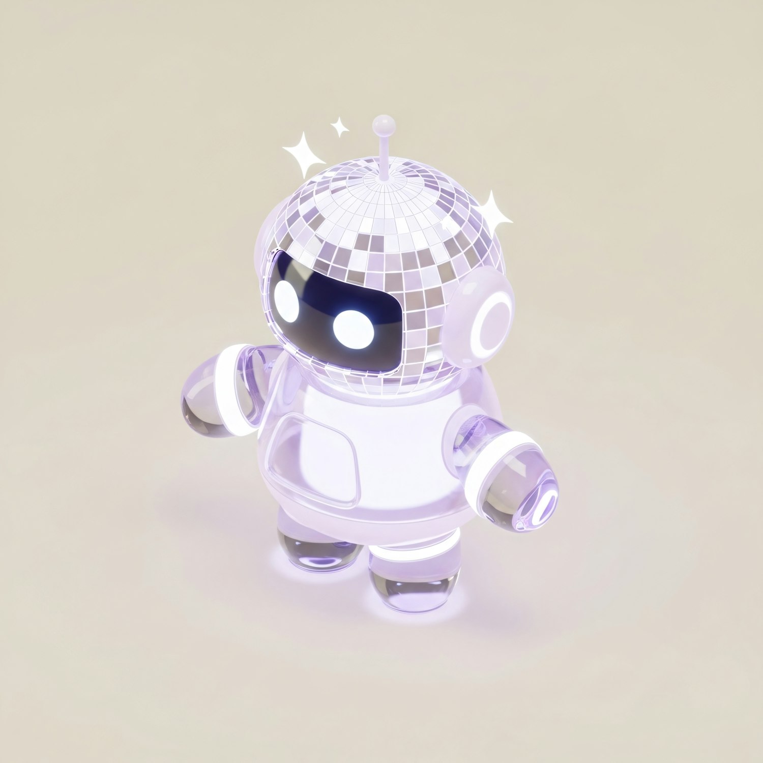 A futuristic 3D robot with a disco ball head and glowing features, rendered in soft purples and whites against a neutral background.