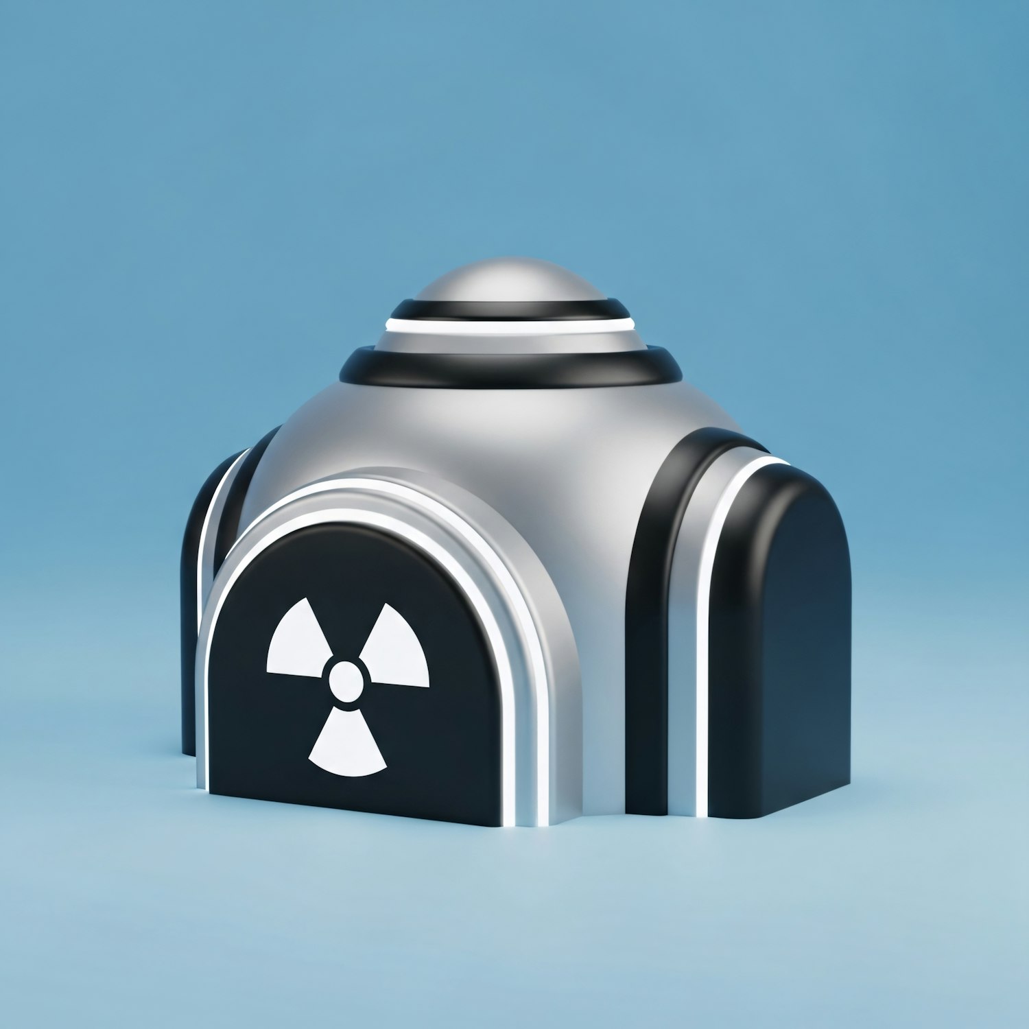 A futuristic 3D-rendered dome-shaped structure with a metallic finish and a radiation hazard symbol on a light blue background.