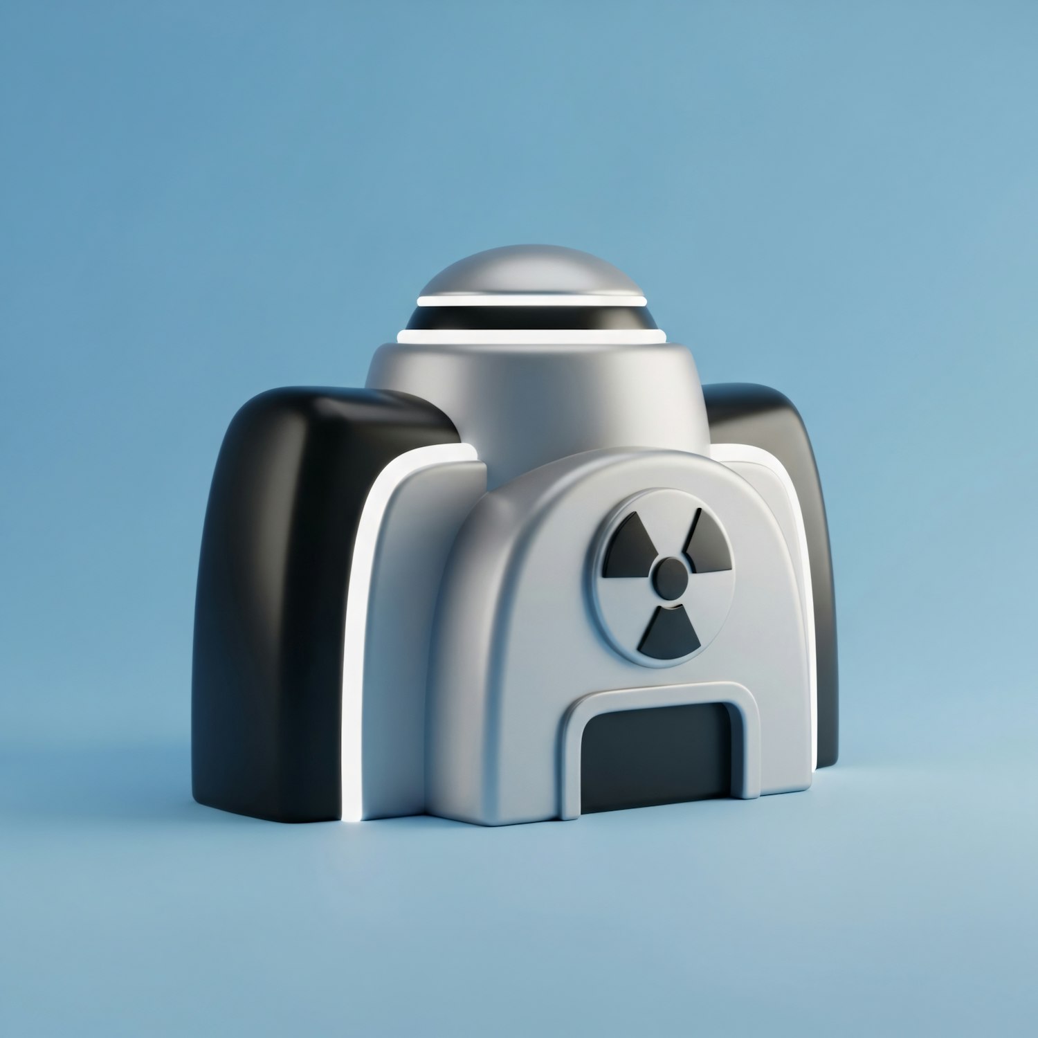 A sleek 3D model of a futuristic building with a radiation symbol, featuring a silver and black design against a blue background.