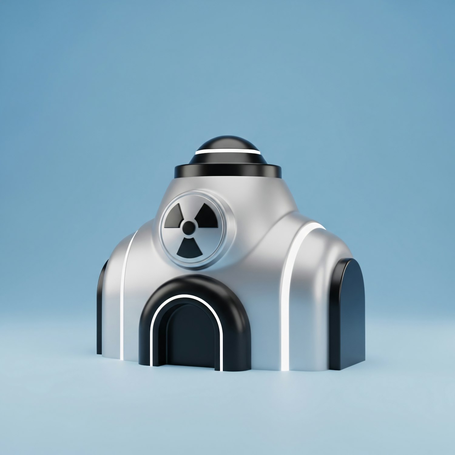 A sleek 3D-rendered futuristic building with a radiation symbol, set against a light blue background.