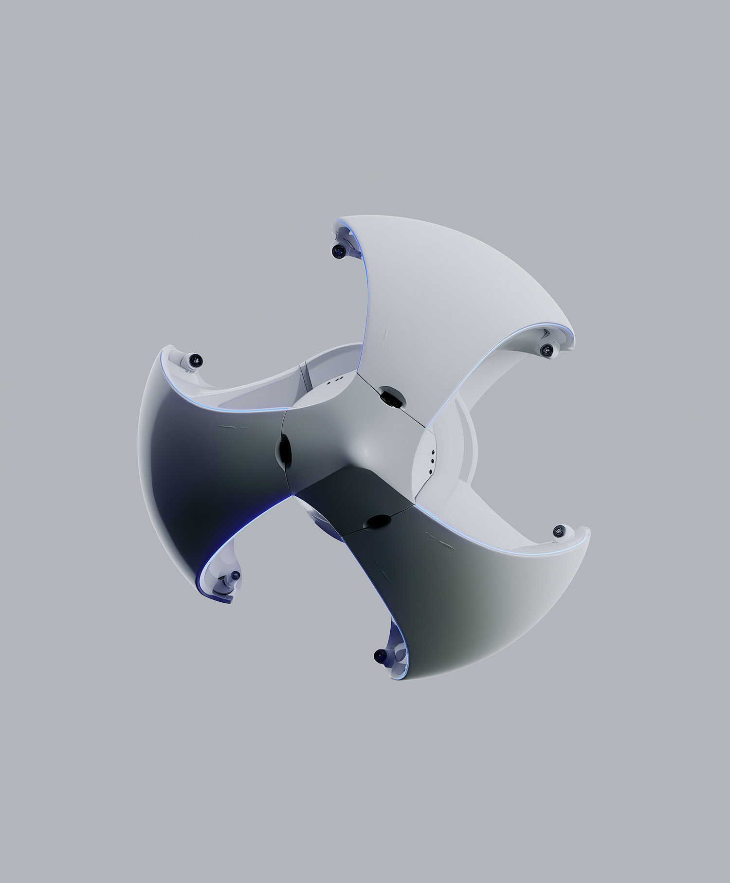 Sleek futuristic drone with curved arms and integrated cameras, showcasing a modern and innovative design against a plain gray background.
