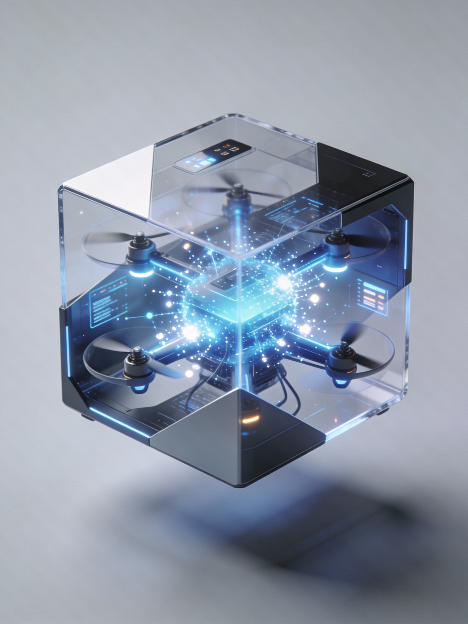 A futuristic drone encased in a transparent cube, glowing with blue lights and holographic effects, showcasing advanced technology.