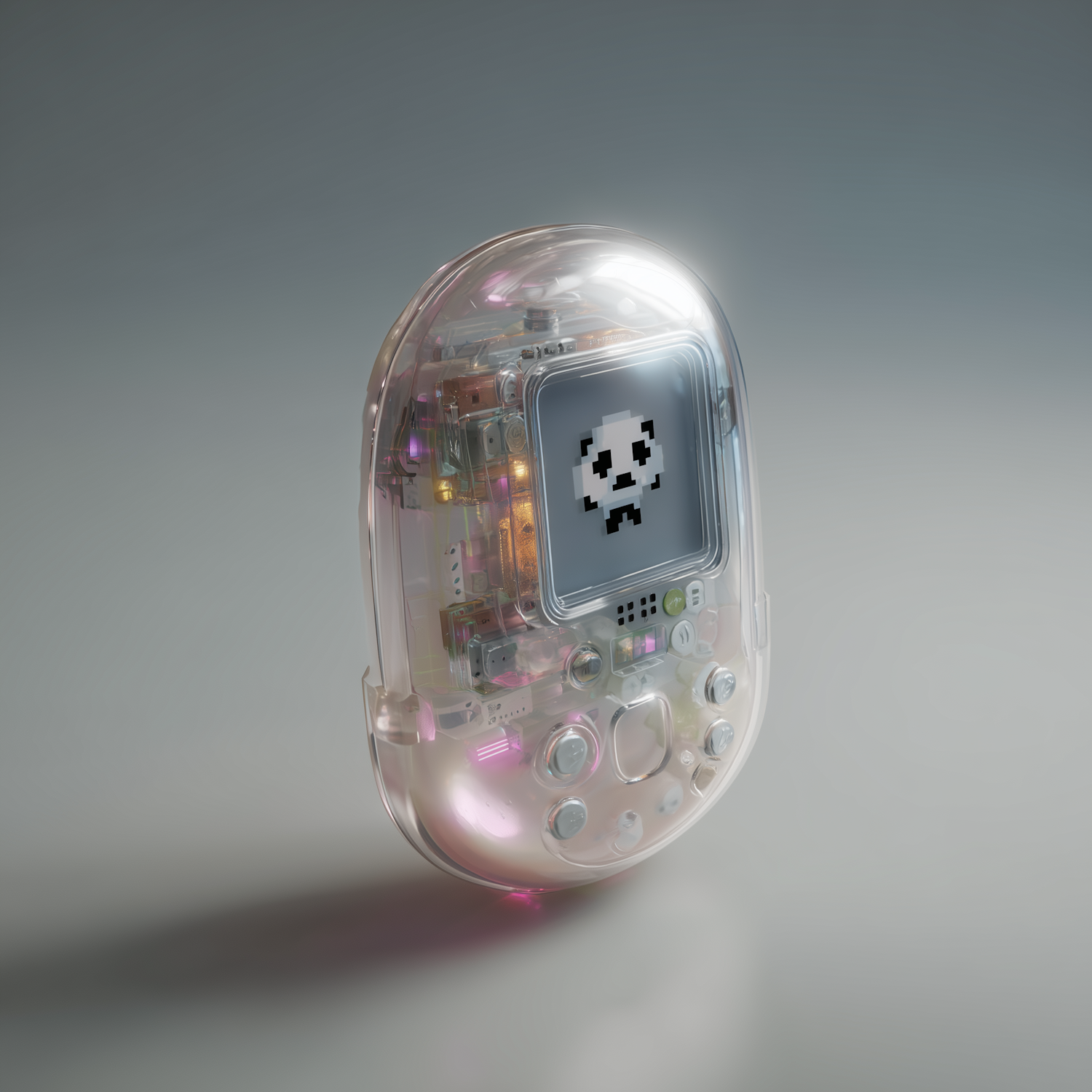 A futuristic translucent electronic device with a pixelated sad face on its screen, showcasing intricate internal circuitry.