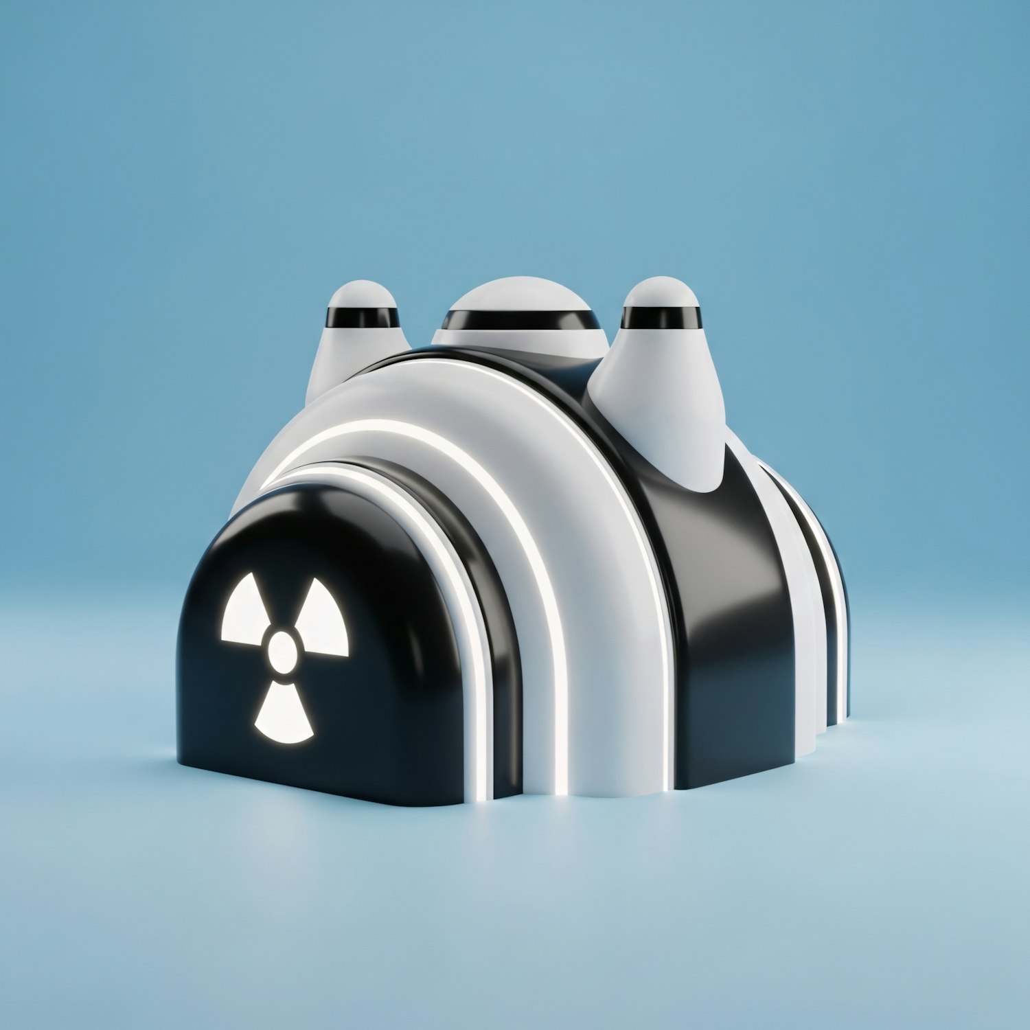 A futuristic 3D-rendered object with a glowing radiation symbol, sleek black and white design, and a clean blue background.