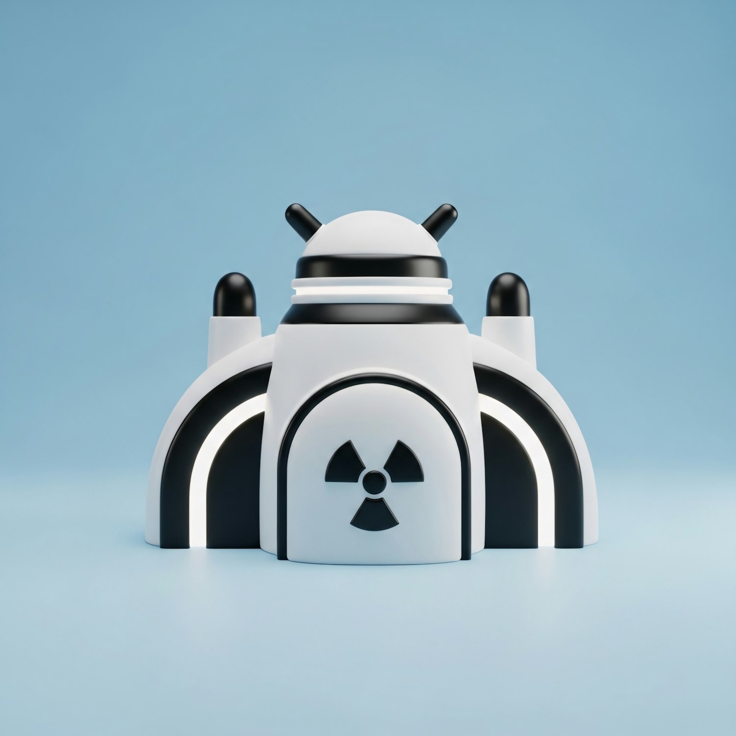 A sleek 3D model of a futuristic structure with a radiation symbol, set against a clean blue background.