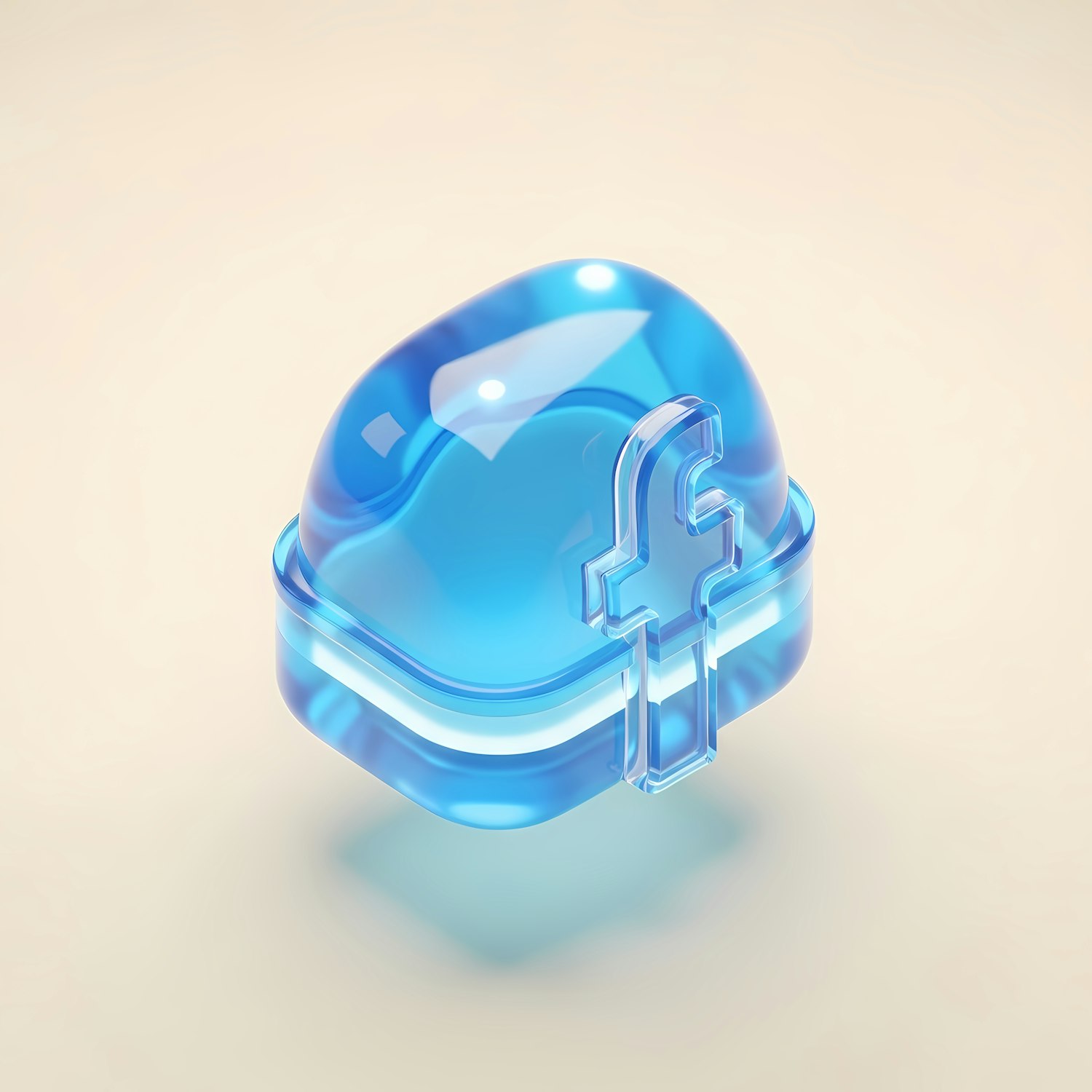 A sleek 3D-rendered translucent blue object with a Facebook logo, set against a soft beige background, showcasing a modern design.
