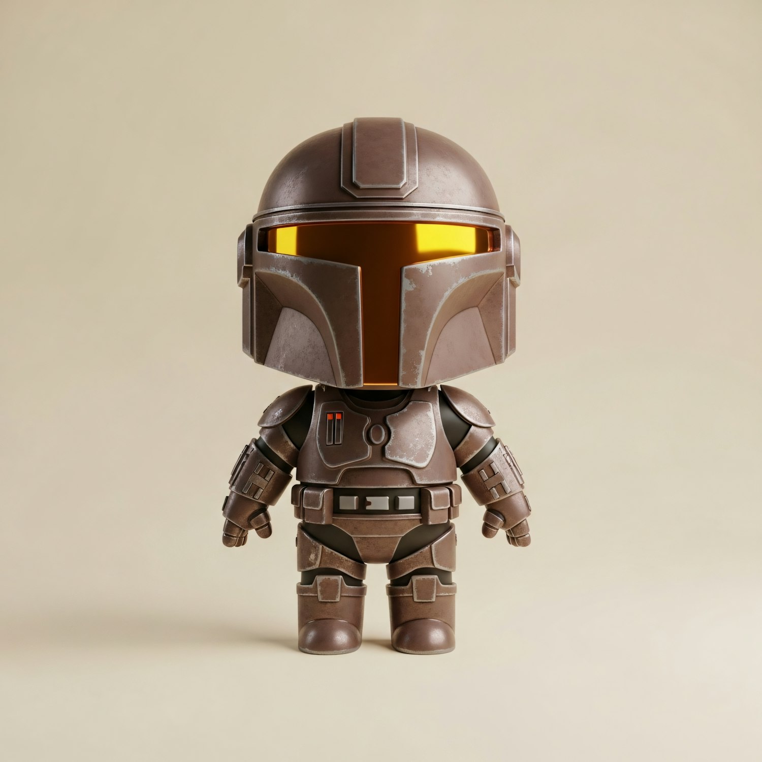 A cute, stylized figurine of a character in metallic brown armor with a glowing yellow visor, set against a plain beige background.