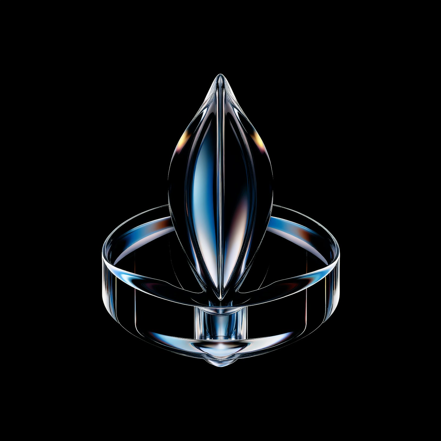 A futuristic 3D-rendered object with reflective surfaces and a sleek, symmetrical design, set against a black background.