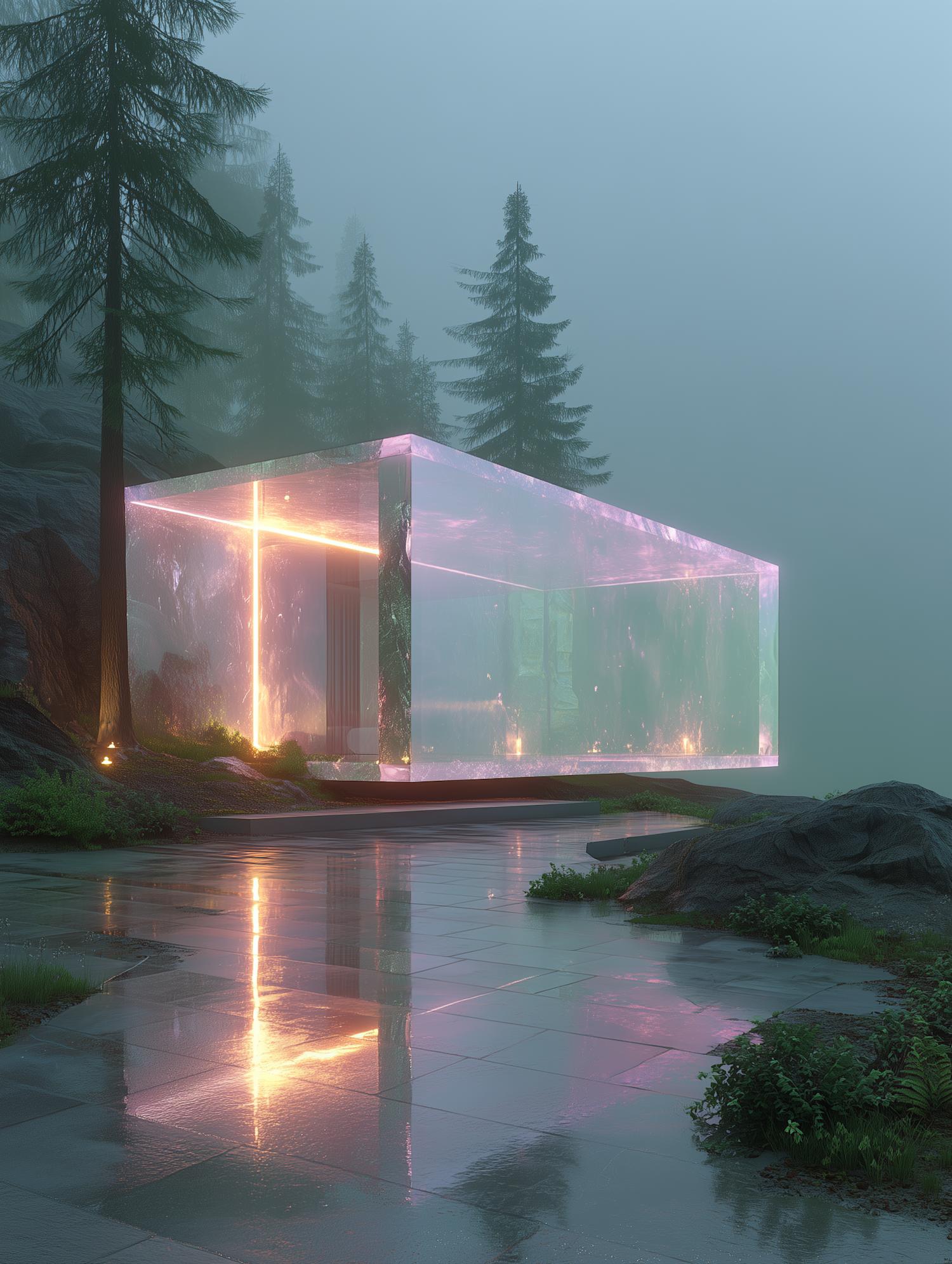 A glowing glass structure in a misty forest, surrounded by wet reflective tiles and tall trees, blending modern design with nature.