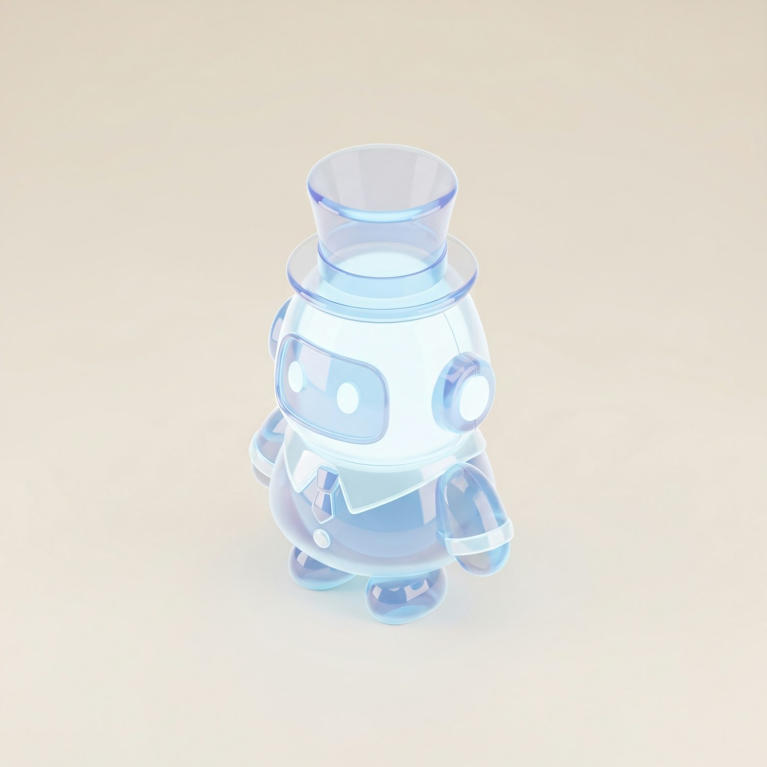 A 3D-rendered translucent robot with a top hat and formal attire, glowing in blue tones against a neutral background.