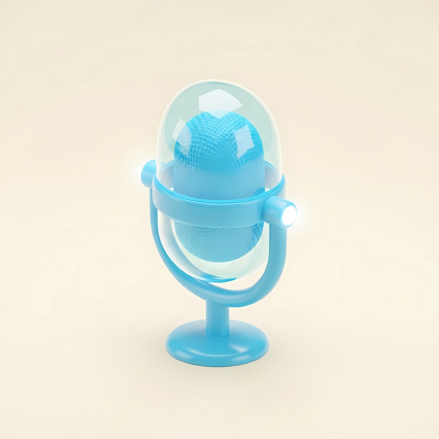 A sleek 3D-rendered blue globe-like object with a transparent dome and textured core, set against a soft beige background.