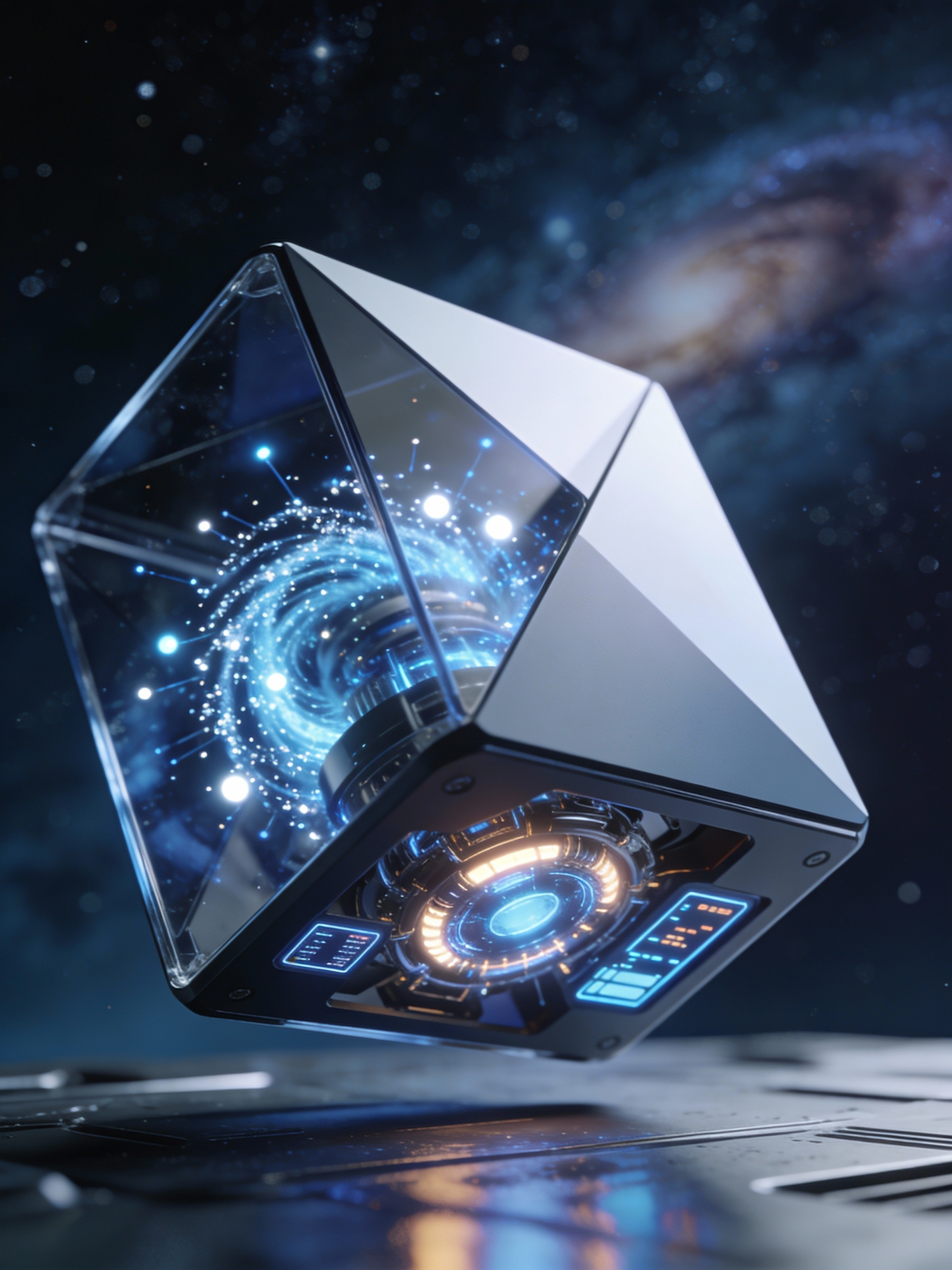 A futuristic glowing cube with intricate mechanisms floats in a cosmic setting, surrounded by stars and a galaxy in the background.