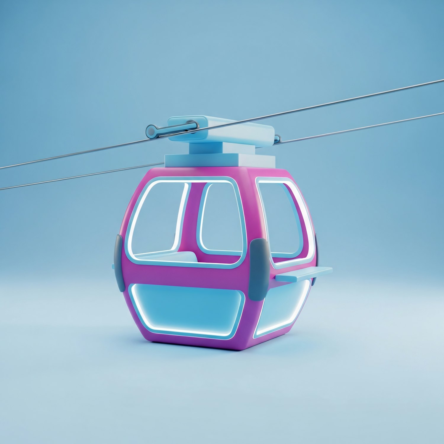 A colorful 3D gondola lift cabin with glowing accents, set against a blue background, showcasing a modern and sleek design.