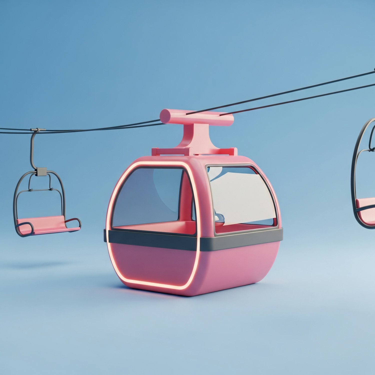 Stylized pink gondola cabins on a cable system against a clear blue background, showcasing modern design and vibrant colors.