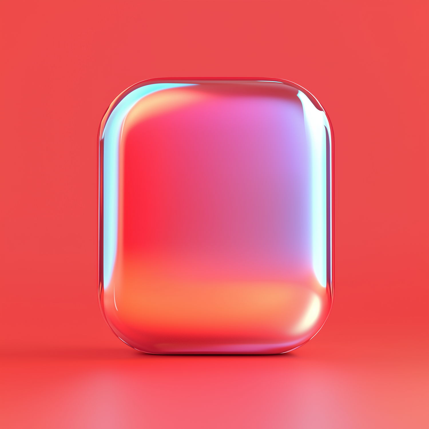 A glossy, rounded rectangular object with vibrant pink, orange, and blue gradients on a solid red background. Modern and futuristic design.