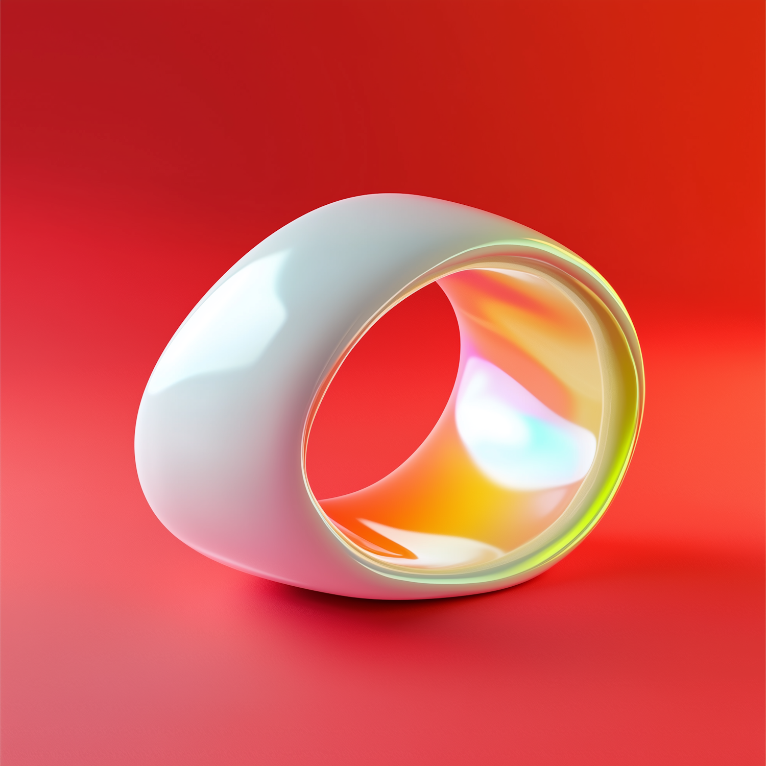 A glossy white 3D torus with a vibrant gradient interior on a bold red background, blending minimalism with futuristic design.
