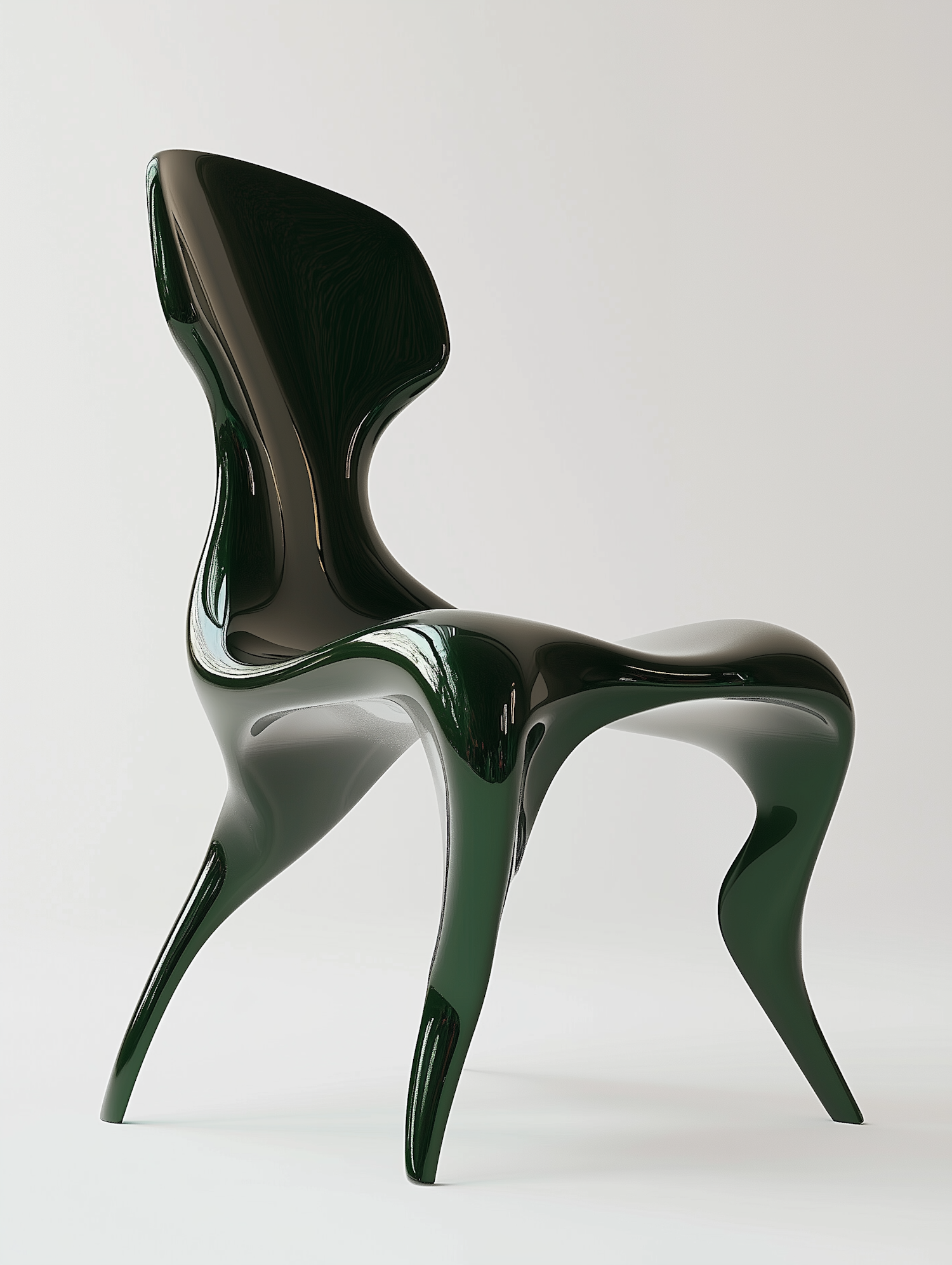 Futuristic dark green chair with a glossy finish, sculptural curves, and a modern, artistic design. Perfect for contemporary interiors.
