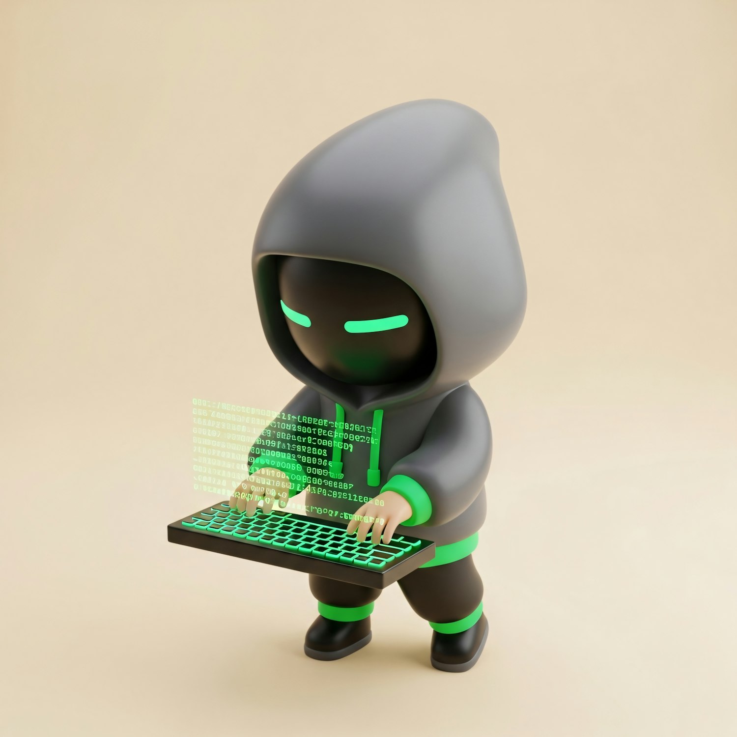 A 3D illustration of a hooded character with glowing green eyes and a keyboard, symbolizing technology and digital themes.