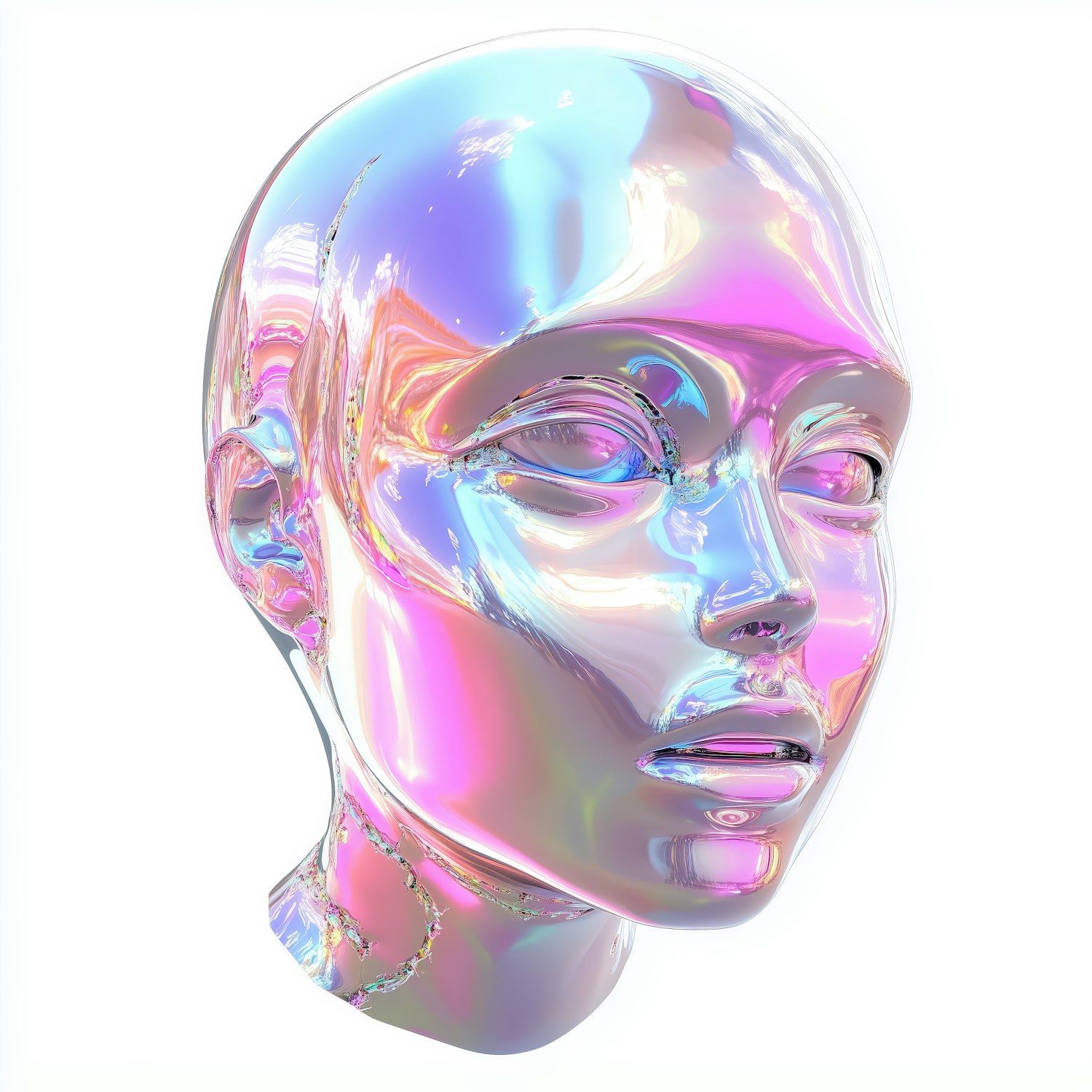 A stunning 3D-rendered head with iridescent hues of pink, blue, and purple on a sleek, reflective surface against a white background.
