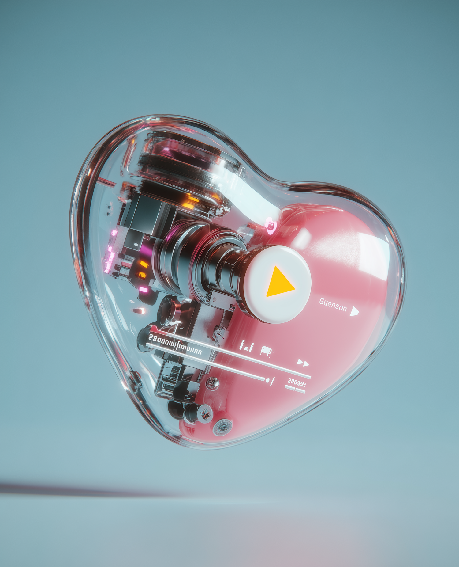 A futuristic 3D-rendered heart-shaped device with transparent casing, glowing lights, and intricate mechanical details.