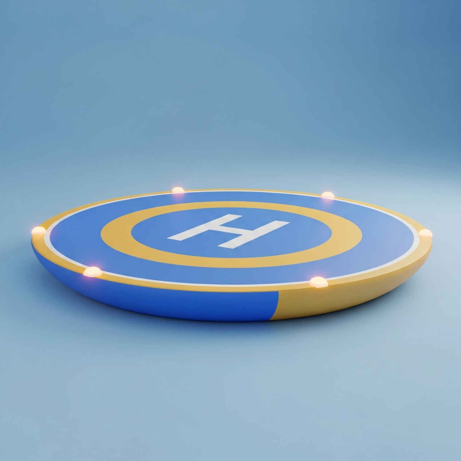 A sleek 3D-rendered helipad with blue and yellow colors, illuminated by perimeter lights, set against a gradient blue background.