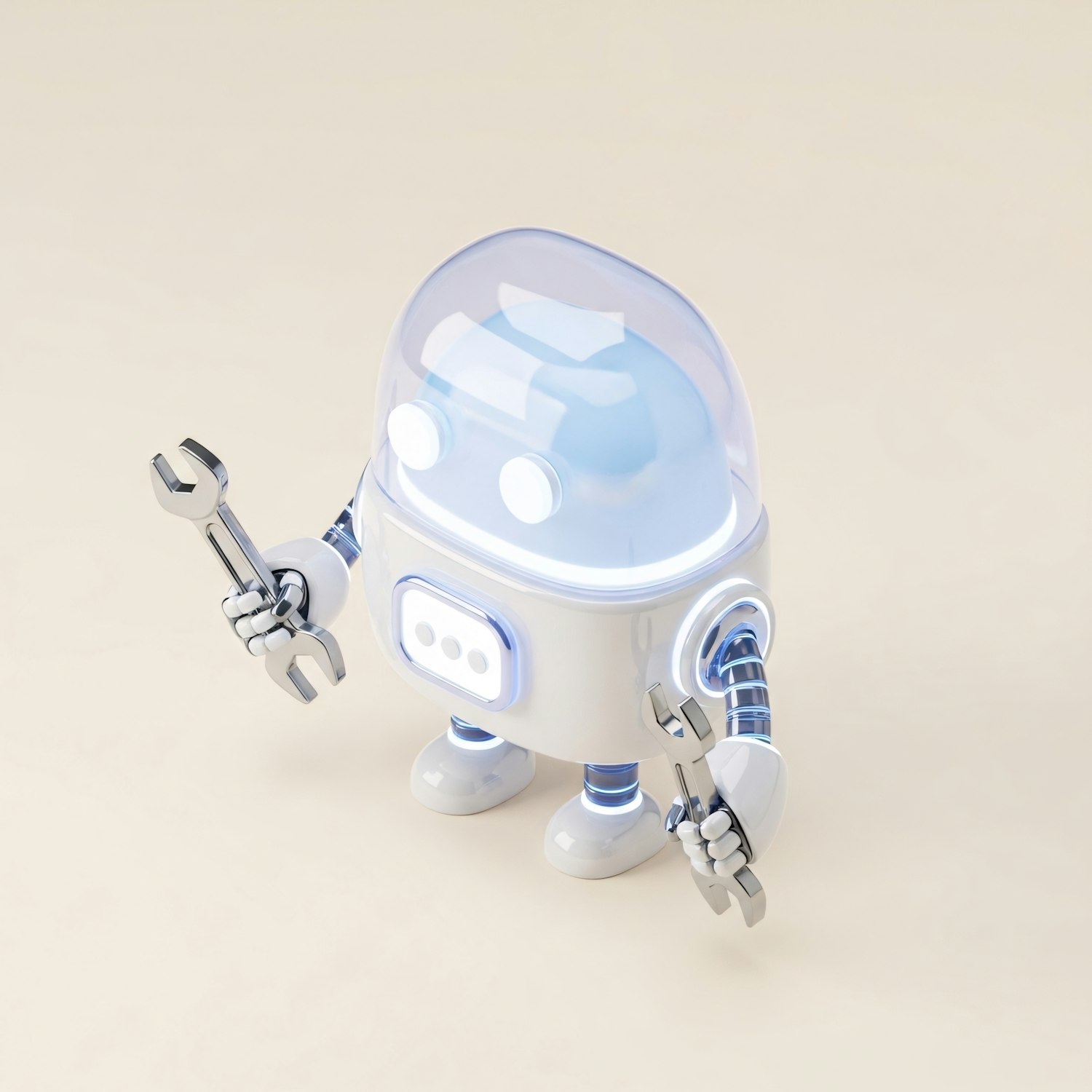 A futuristic 3D robot holding wrenches, designed with a sleek white and silver body and glowing blue accents, standing on a neutral background.