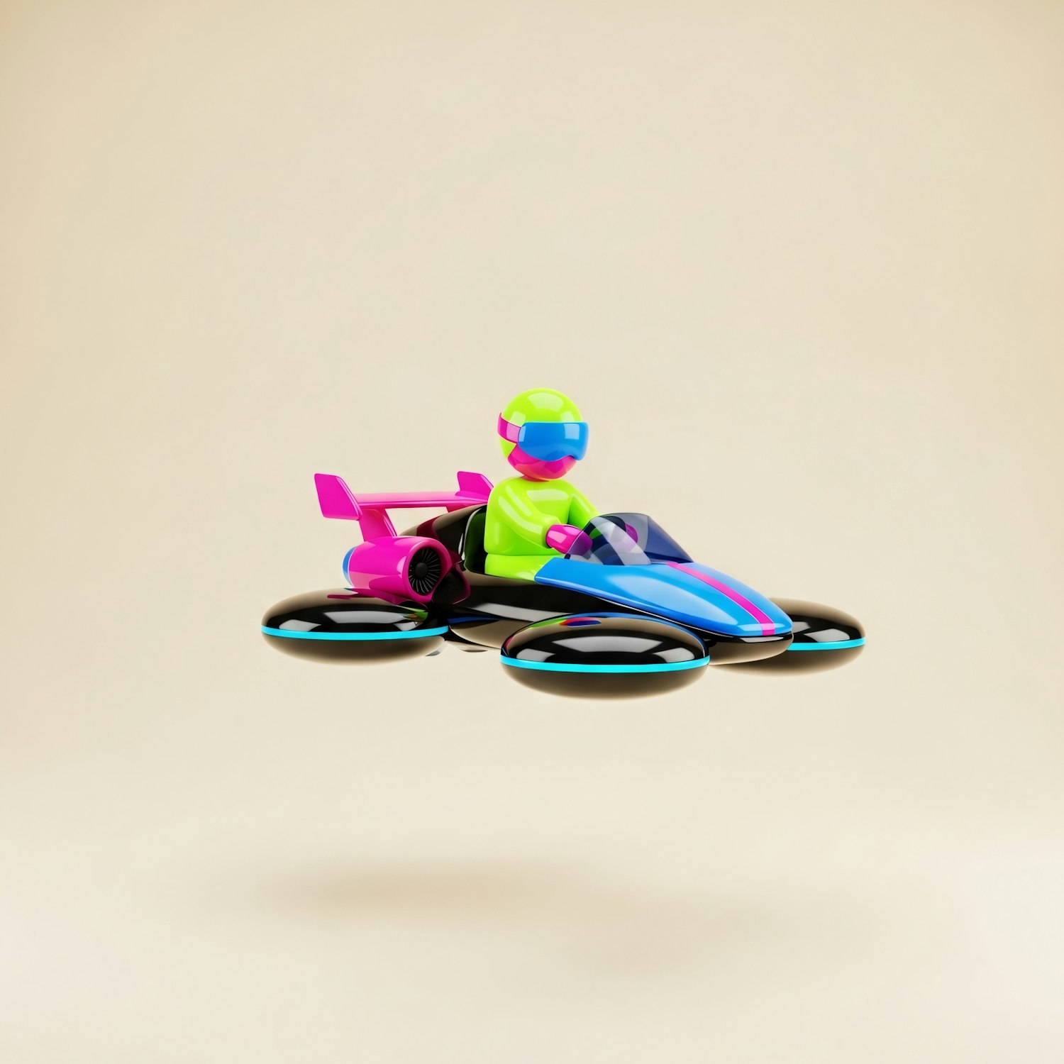 A colorful 3D illustration of a futuristic hovercraft piloted by a neon green figure, set against a neutral background.
