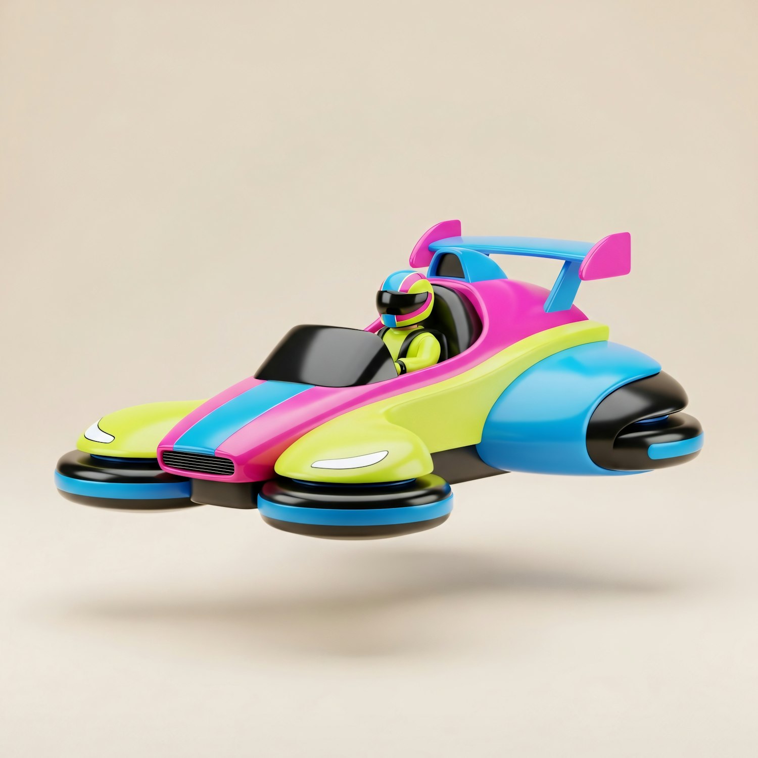 A colorful futuristic hovercraft with a neon design and a driver in a matching suit, floating against a neutral background.