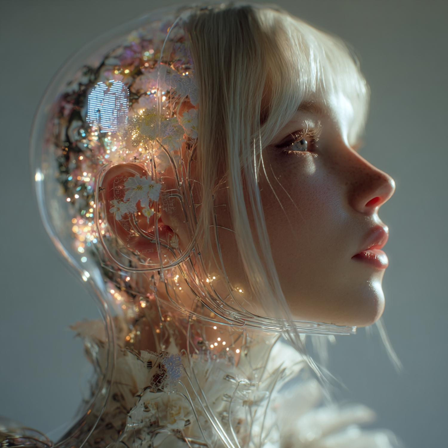 A futuristic humanoid with a translucent head, glowing circuits, and floral motifs, blending organic and technological aesthetics.