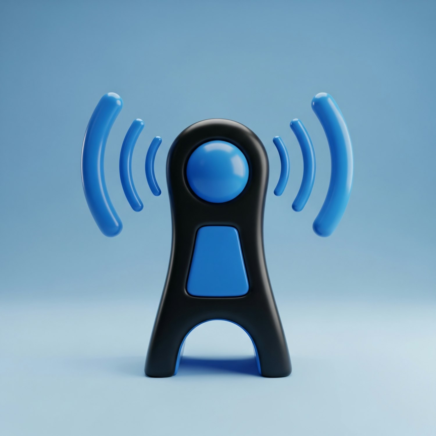 A sleek 3D-rendered humanoid figure with signal waves, set against a gradient blue background, symbolizing technology and connectivity.