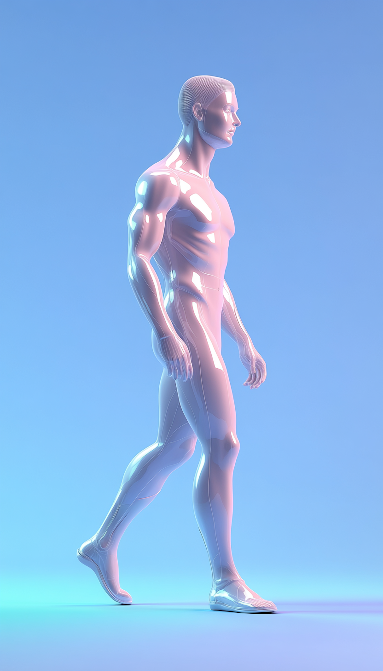 Futuristic 3D humanoid figure walking with a glossy, reflective surface and dynamic lighting in a minimalistic blue gradient background.